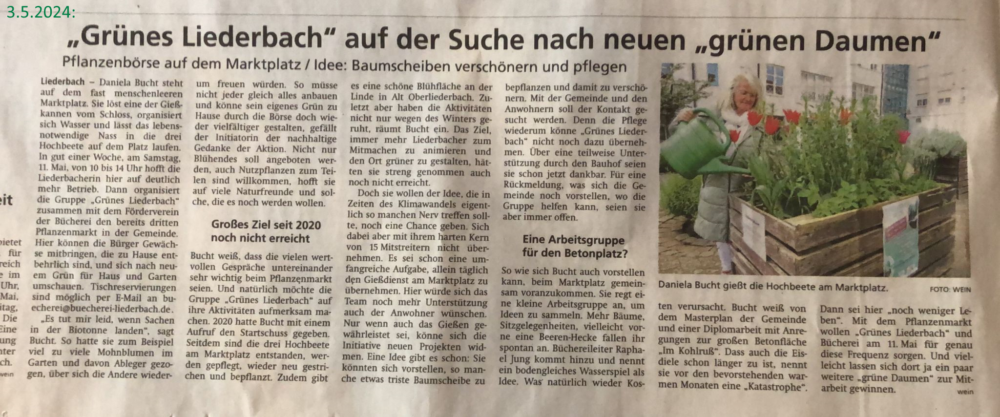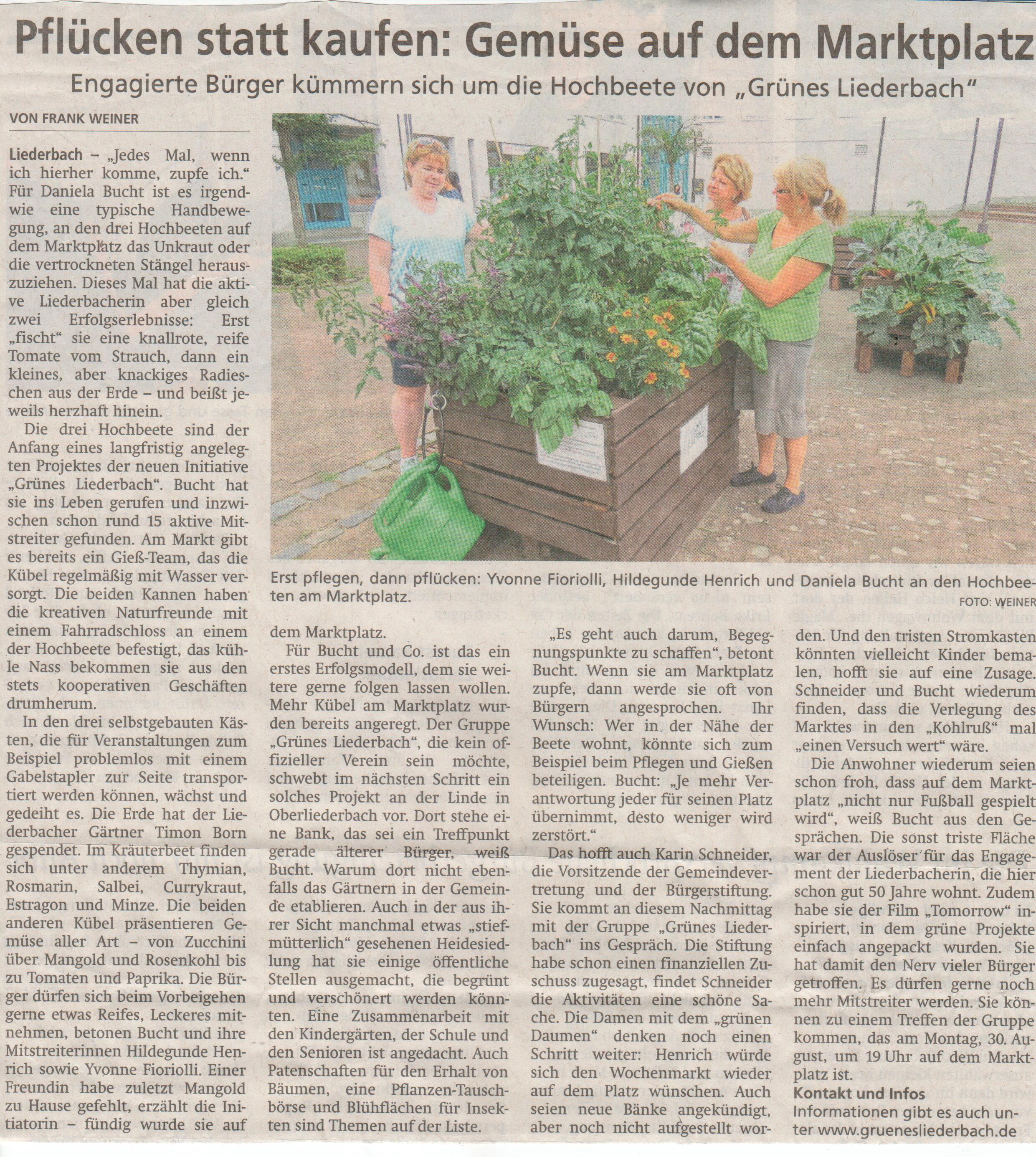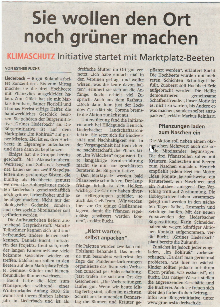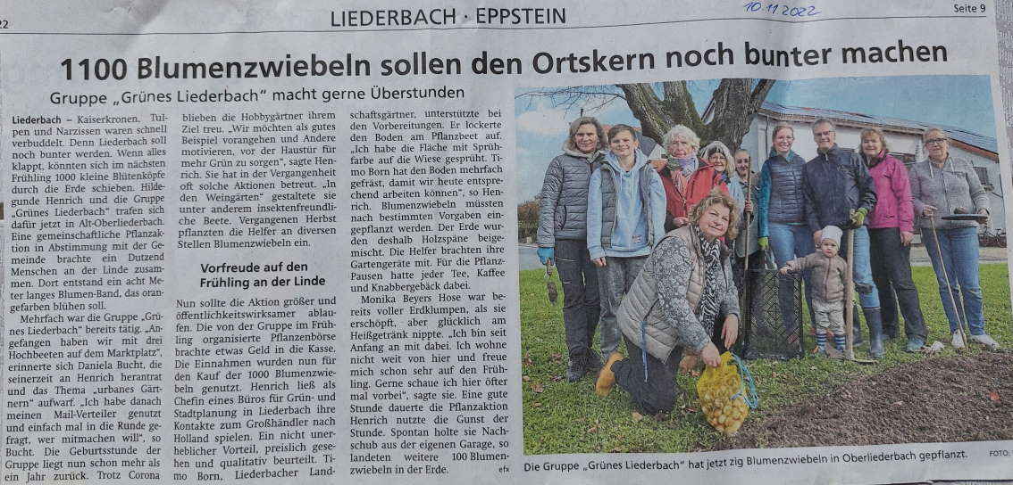 Wir sind eine Gruppe von ca. 15 Liederbachern, die sehr gerne in Liederbach zu Hause sind und Lust und Ideen haben, wie in Liederbach gemeinsam gegärtnert werden und dadurch Treffpunkte und Lebendigkeit entstehen könnte. Das könnte wiederum andere Menschen aller Altersklassen anziehen/ansprechen.